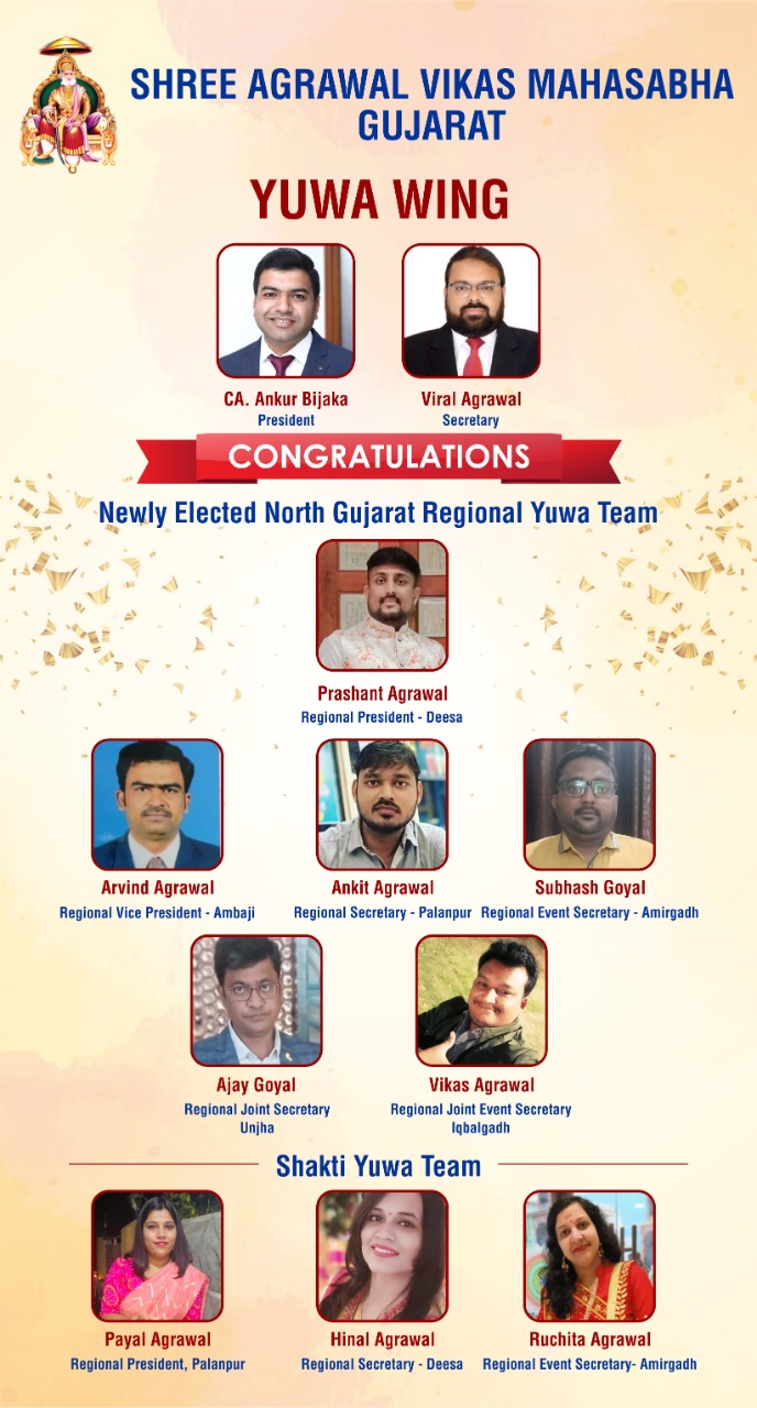 શ્રી અગ્રવાલ વિકાસ મહાસભા અમદાવાદ દ્વારા સમગ્ર ગુજરાતના અગ્રવાલ સમાજને સંગઠિત કરવા માટે અને આગળ વધારવા માટે તેમજ સમાજને સુદ્રઢ બનાવવા માટે ગુજરાતમાં ક્ષેત્રિય સ્તરે કાર્યકારી ટીમ નું ગઠન કરવામાં આવ્યું હતું.સમગ્ર ગુજરાતને ચાર ક્ષેત્રમાં વહેંચવામાં આવ્યું છે અને દરેક ક્ષેત્રમાં ક્ષેત્ર વાઇઝ પદાધિકારીઓની નિમણૂક કરવામાં આવી છે અને દરેક ક્ષેત્રમાં યુવા વિંગ પણ બનાવવામાં આવી છે અને તેમાં પદાધિકારીઓની નિમણૂક કરવામાં આવી છે જેમાં સમાજના યુવા વર્ગની નિમણૂક કરવામાં આવી છે જેથી કરીને સમાજનો યુવા વર્ગ સમાજના કામમાં રુચિ લે અને સમાજ આગળ વધે. જુદા જુદા ક્ષેત્રના યુવાઓને જે તે ક્ષેત્રની યુવા વીંગ માં જોડીને તેમને વિવિધ હોદ્દા ઉપર જવાબદારી આપવામાં આવી છે યુવા વિંગના પ્રેસિડેન્ટ તરીકે અંકુર બીજાકા તેમજ સેક્રેટરી તરીકે વિરલ અગ્રવાલની નિમણૂક કરવામાં આવી હતી. ઉત્તર ક્ષેત્રમાં યુવા વિંગમાં રિજનલ પ્રેસિડેન્ટ તરીકે ડીસાના પ્રશાંત અગ્રવાલની નિમણૂક કરવામાં આવી હતી જ્યારે રીજનલ વાઈસ પ્રેસિડન્ટ તરીકે અંબાજીના અરવિંદ અગ્રવાલની નિમણૂક થઈ હતી તેમજ રિઝનલ સેક્રેટરી તરીકે પાલનપુરના અંકિત અગ્રવાલ અને ઇવેન્ટ સેક્રેટરી તરીકે સુભાષ ગોયલ ની નિમણૂક કરવામાં આવી હતી. જોઈન્ટ સેક્રેટરી તરીકે ઊંજાના અને અજય ગોયલની નિમણૂક કરવામાં આવી હતી તથા જોઈન્ટ ઇવેન્ટ સેક્રેટરી તરીકે વિકાસ અગ્રવાલ ને જવાબદારી આપવામાં આવી હતી. તેમજ મહિલાઓની ટીમમાં રિજનલ પ્રેસિડેન્ટ તરીકે પાલનપુર ની પાયલ અગ્રવાલ, સેક્રેટરી તરીકે ડીસાની હીનલ અગ્રવાલ તેમજ રિજનલ ઇવેન્ટ સેક્રેટરી તરીકે અમીરગઢની રુચિતા અગ્રવાલની નિમણૂક કરવામાં આવી હતી