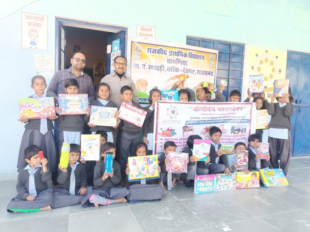 प्रतियोगी परीक्षाओं की समझ बनाकर उसमे स्थान बना सके,अंत्योदय फाउंडेशन द्वारा स्कूली बच्चो की शैक्षिक मदद के क्रम में अब तक पूरे देश में 1000 से ज्यादा खिलौना बैंक खोले जा चुके हे और सैकड़ों विद्यालयों में स्मार्ट टीवी,प्रोजेक्टर आदि भेंट किए गए हे साथ ही हजारों बच्चो तक कपड़े,जूते,खिलोने,और दिव्यांग बच्चो तक व्हिलचेयर पहुंचा कर इनकी मदद की जा रही हे।