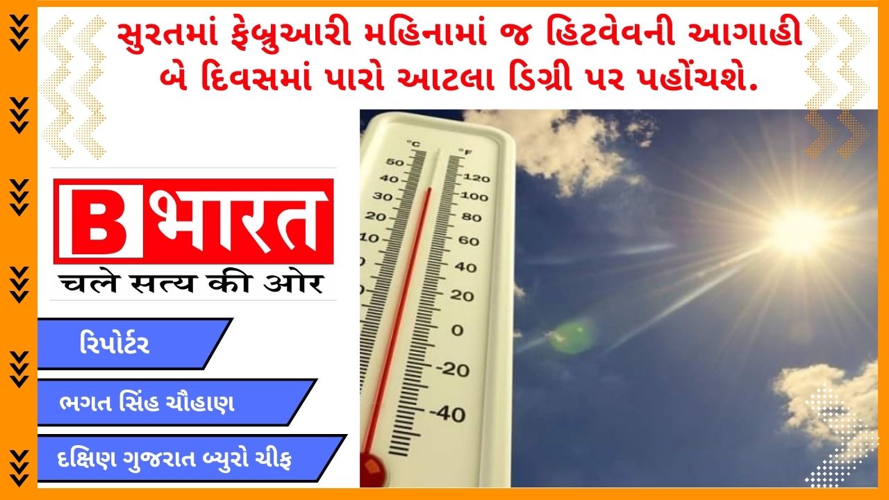 સુરત: સુરતશહેરમાં હજી ઠંડી માંડ વિદાય લઈ રહી છે ત્યાં ગરમીએ પ્રકોપ વર્તાવવાનો શરૂ કરી દીધો છે. આજે ગરમીનો પારો 38 ડિગ્રીને પાર પહોંચતા ફેબ્રુઆરી મહિનાની ગરમીએ છેલ્લા 6 વર્ષનો રેકોર્ડ બ્રેક કર્યો છે. આજે 38 ડિગ્રી ટેમ્પરેચર રહ્યું, હવામાન વિભાગની આગામી મુજબ બે દિવસમાં ગરમીનો પારો 40 ડિગ્રી સુધી પહોંચી શકે છે હવામાન વિભાગના જણાવ્યા મુજબ શહેરમાં હવે ગરમીનો પ્રારંભ થયો છે. હવામાન વિભાગે આવતા અઠવાડિયાથી આકરી ગરમીના સંકેત આપ્યા હતા. પરંતુ તેના અઠવાડિયા પહેલાં જ ગરમીએ તેવર બતાવવાનું શરૂ કરી દીધું છે. શહેરમાં આજે મહત્તમ તાપમાન એક ડિગ્રી વધીને 38.4 ડિગ્રી નોંધાયું હતું. જ્યારે લઘુત્તમ તાપમાન પણ એક ડિગ્રી વધીને 20.4 ડિગ્રી નોંધાયું હતું. હવામાં 28 ટકા ભેજની સાથે 4 કિલોમીટરની ઝડપે ઉત્તરનો પવન ફુંકાયો હતો. આગામી બે દિવસમાં પવનોની દિશામાં ફેરફાર થવાની સાથે ગરમી વધારે સખત બનવાની આગાહી હવામાન વિભાગે કરી છે. આગાહી પહેલાં જ આજે ગરમીએ કહેર વર્તાવ્યો હોય તેવો અનુભવ થયો હતો. બપોરે ચામડી દઝાડે તેવી ગરમીનો અનુભવ શહેરીજનોએ કર્યો હતો. હજી તો ગરમીની શરૂઆત છે ત્યારે ફેબ્રુઆરી મહિનાની ગરમીએ 6 વર્ષનો રેકોર્ડ બ્રેક કર્યો છે. આગામી દિવસોમાં ગરમી પાછલા વર્ષોનો રેકોર્ડ તોડશે તો નવાઈ નથી. બીજી તરફ હવામાન વિભાગે આગામી બે દિવસમાં હીટવેવની પણ આગાહી કરી છે.